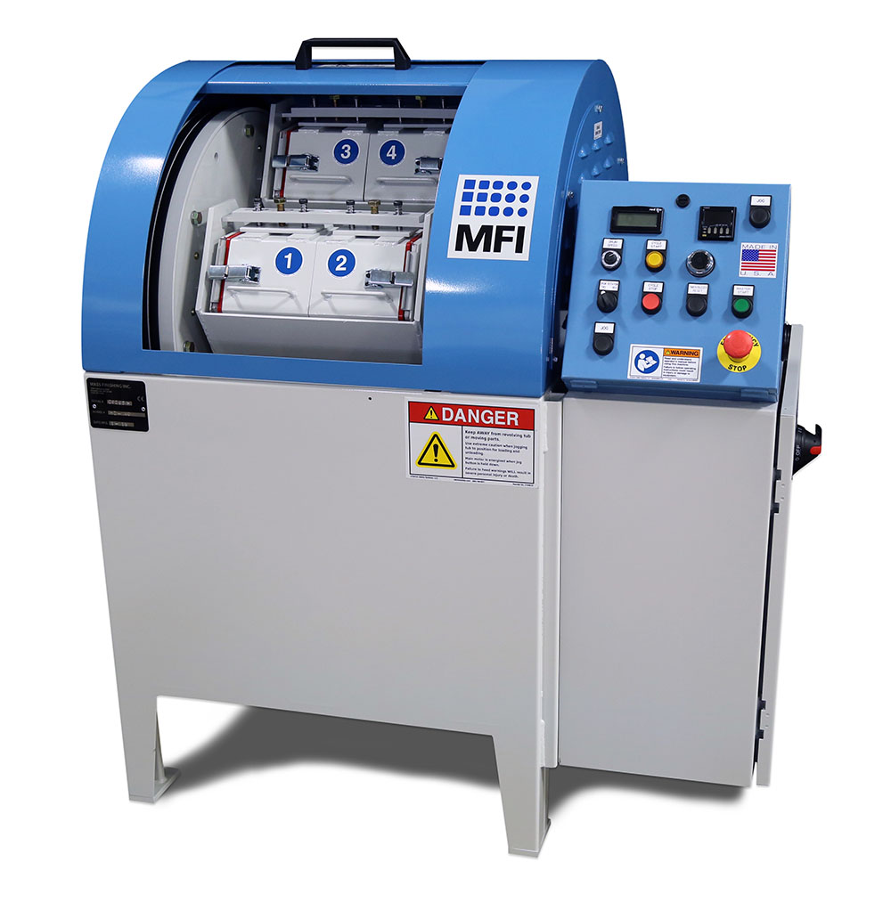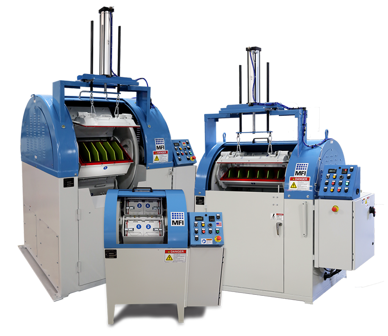 離心式筒式精加工機(jī)采用“費(fèi)里斯輪”原理。四桶中的每一個(gè)裝滿大約50-80%的充滿介質(zhì)、部件、水和化合物。